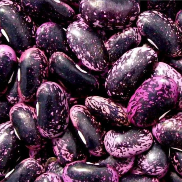 Scarlet Runner Bean seeds are large, oval, and strikingly patterned with deep purple or black hues marbled with pink. Smooth and glossy, they grow into vigorous vines with bright red flowers. Edible when young, they can also be dried for cooking, making them both ornamental and nutritious.